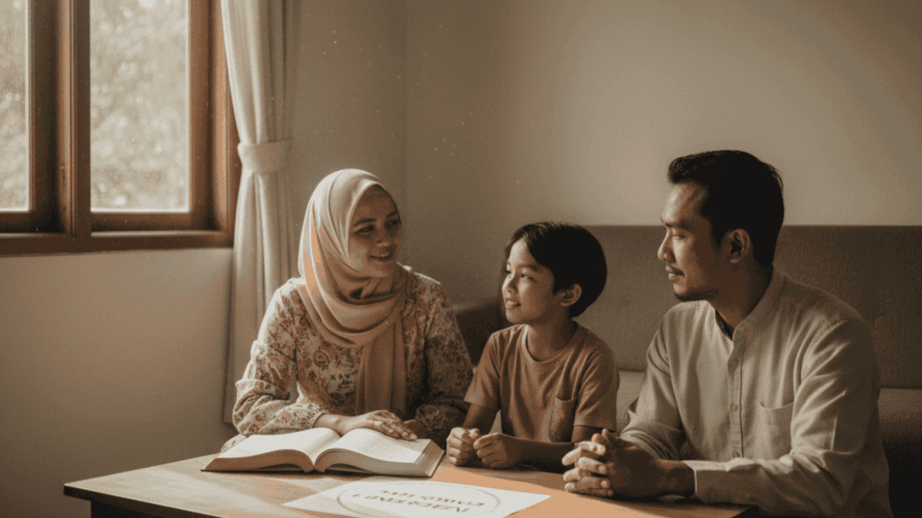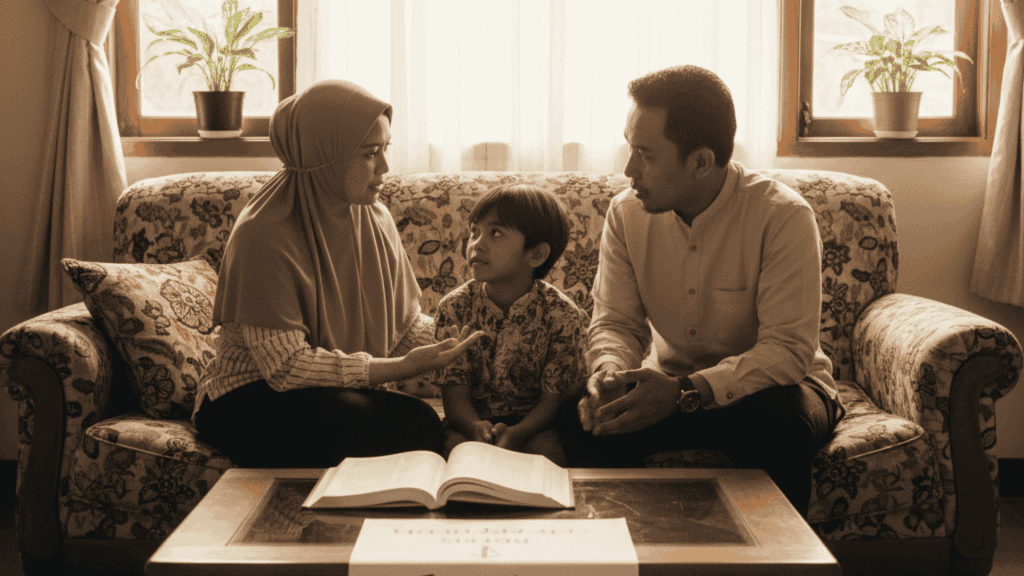 - Standar keluarga: “Sholat tepat waktu, dan ada satu kegiatan keluarga bersama setiap minggu (misalnya refleksi, doa, atau outing).”