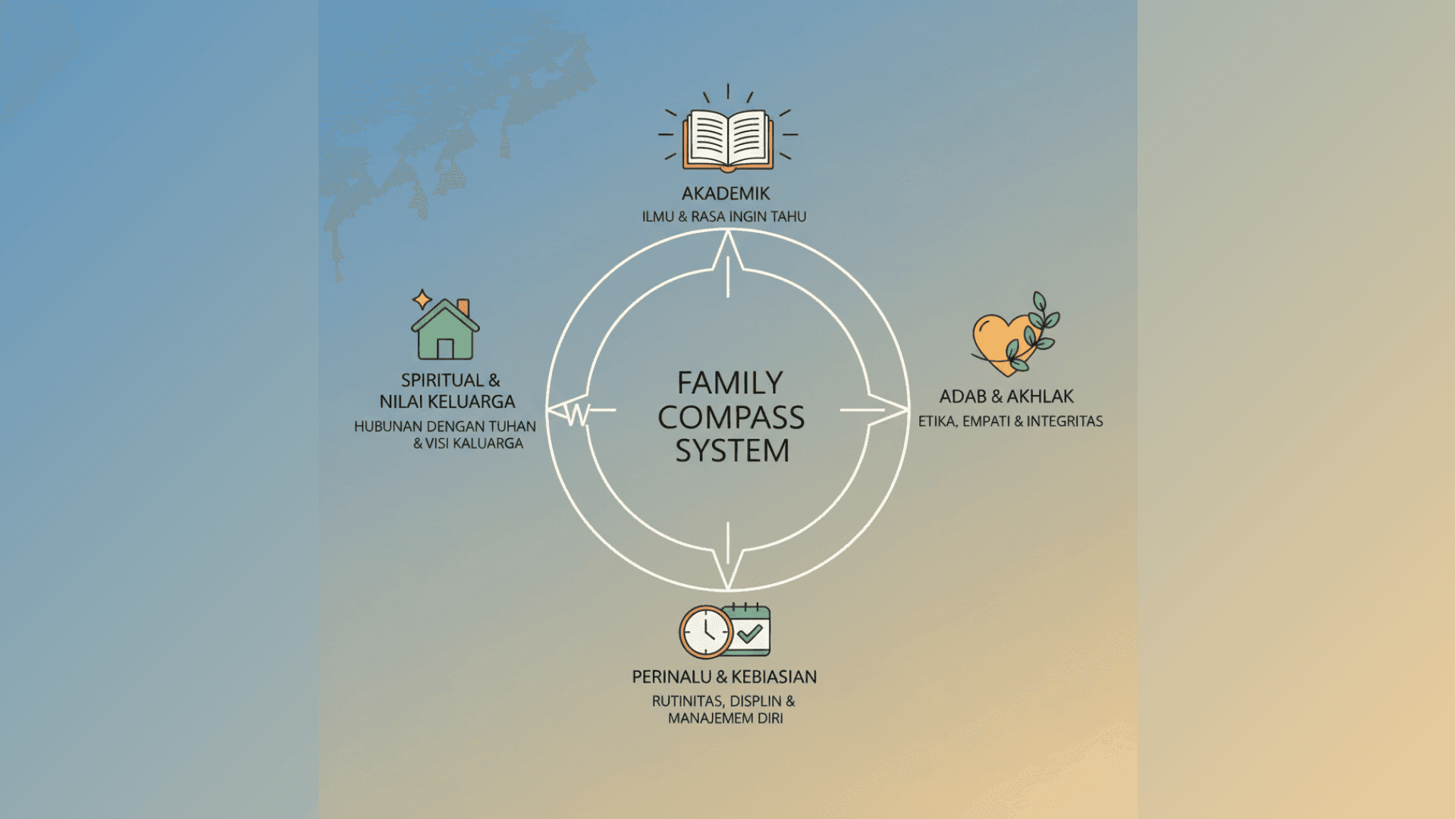 Empat arah ini tidak berdiri sendiri. Seperti kompas, semuanya saling melengkapi untuk menuntun perjalanan keluarga.